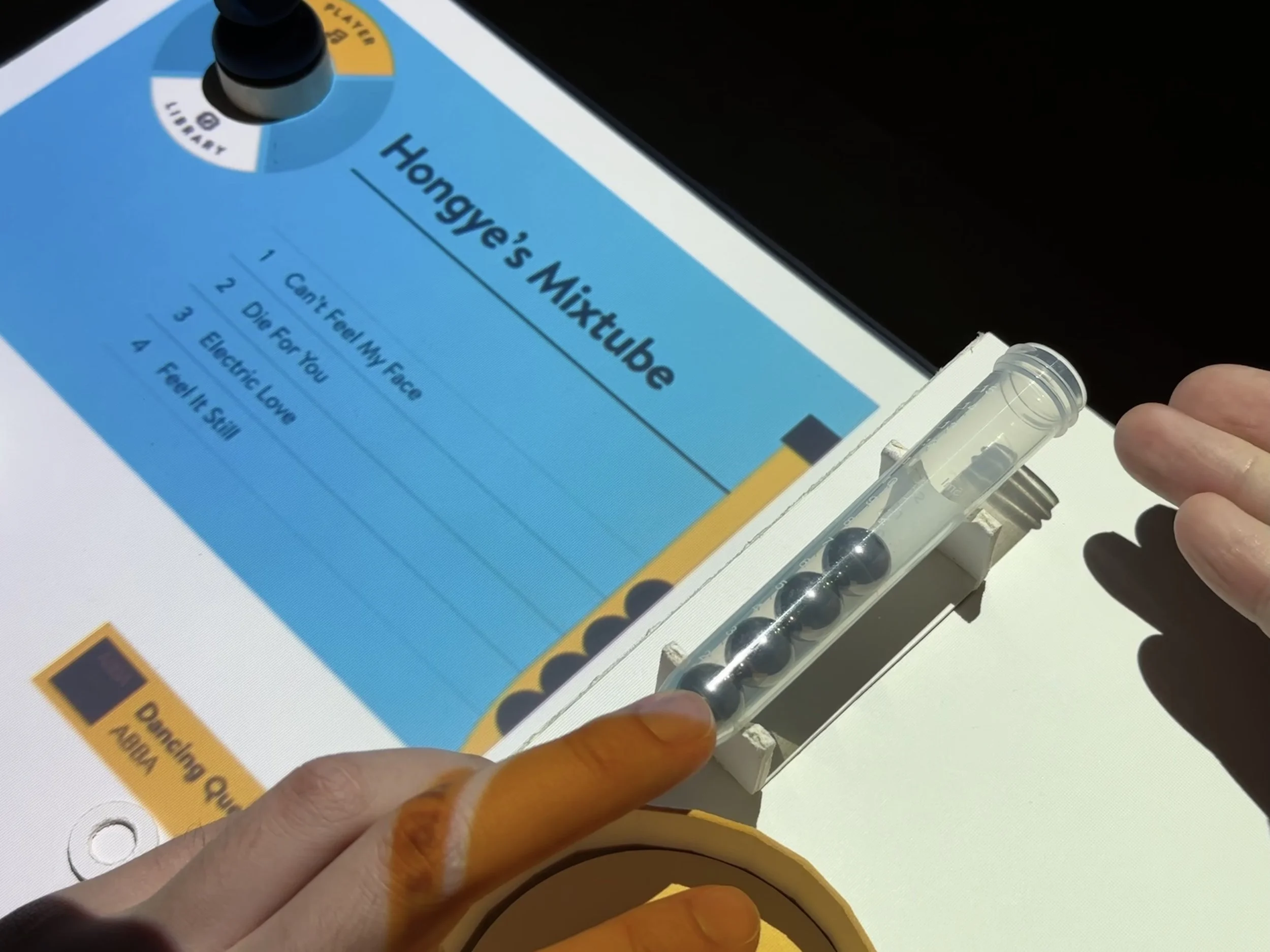 The assignment of music to tokens follows the same process as before (dispensing into individual metal ball tokens). But, instead of placing it into the bin, the user can insert each ball – one by one – into the mixtube.