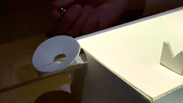A message then appear on the notification screen indicating the dispensing of the metal ball from the side of the device. A side indicator on the right frame edge follows the dispensing of the metal ball (token of a track), which is dispensed through a depressed rail down the slope, arriving at a slot at the bottom for the user to retrieve.